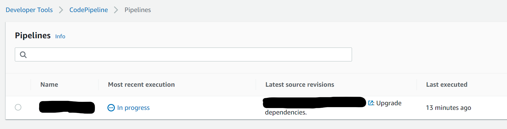 pipeline.CodePipline执行是(a)在对源的更改时触发的,(b)意味着从开始到完成运行所有阶段。执行死刑是很难打断。独立部署环境的需求的一个结果是,最好将环境建模为独立的管道,而不是单个管道中的各个阶段。
