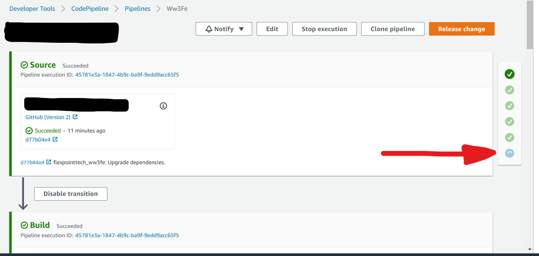 你是对的,ManualApprovalStep不是一个自然的“促进”机制。他们是为了是-没有批准,并将导致如果拒绝执行或7天后执行失败。残疾阶段过渡也会笨拙地使用您的用例。