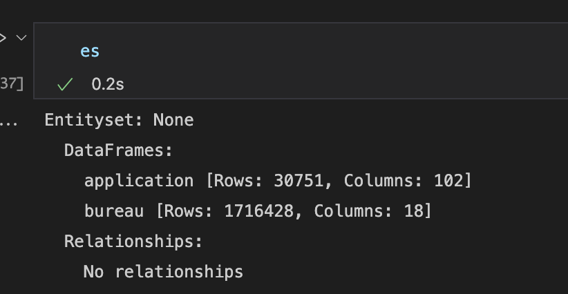 es.add_relationship('application', 'SK_ID_CURR', 'bureau', 'SK_ID_CURR')最后,还可以使用EntitySet.add_relationships方法添加关系,通过传入一个Relationship对象列表,可以向EntitySet添加一个或多个关系: