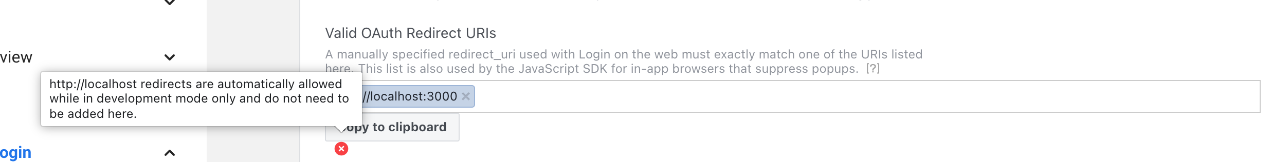 但是,我不能将URL添加到有效的OAuth重定向URL,因为Facebook告诉我本地主机是在开发模式下自动批准的,所以我不允许添加它。但这很奇怪,因为商业应用没有“开发模式”。