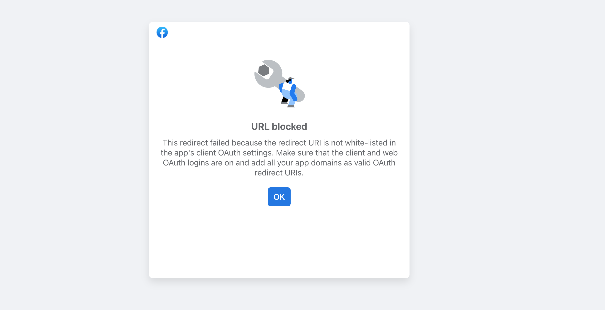 可能值得通过Facebook登录消息:"URL阻塞:这个重定向失败,因为重定向URI没有在应用程序的客户端OAuth设置中白名单。“查看这个线程。