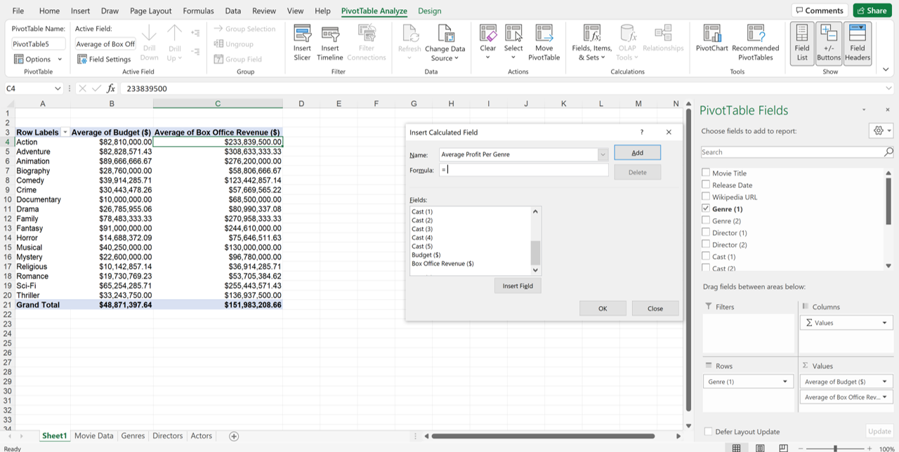 第一步:作为数据透视表将不允许您添加列,开始键入单元格D3,列的标题为“平均利润”。在单元格D4中,键入公式=C4-D4 (计算平均票房减去平均预算=平均利润)。然后填写从细胞D4,以获得平均利润为每种类型。