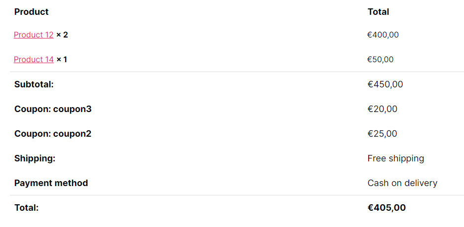 如果使用了2张折扣券,则在Woocommerce订单总计表中显示2张优惠券的总和,而我想分别显示每张优惠券的扣除成本。