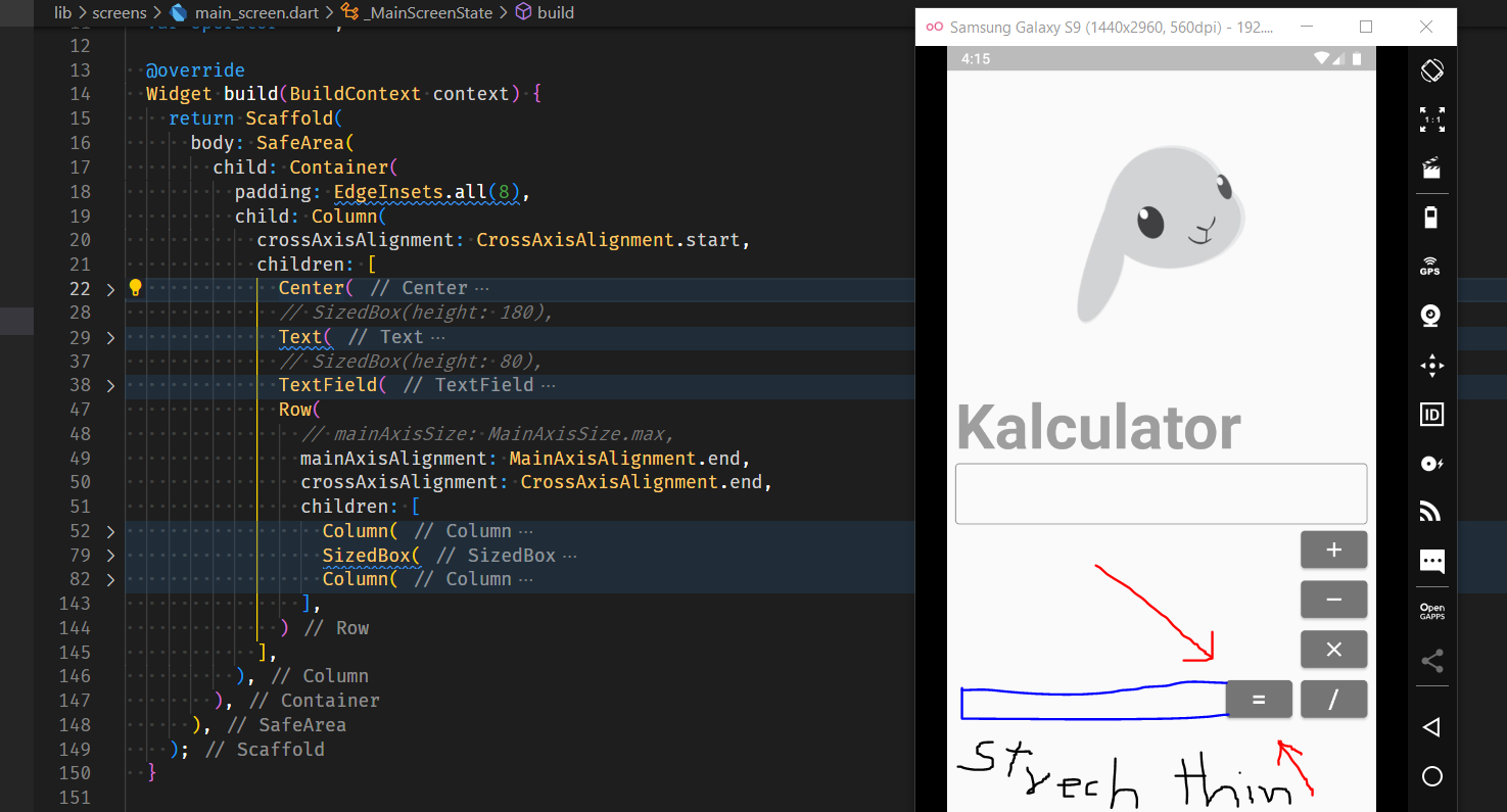 假设=按钮和/按钮都在Row小部件中,您可以将=按钮包装在Expanded小部件中,迫使它占用=小部件上的所有可用空间。下面是一个简单的例子:
