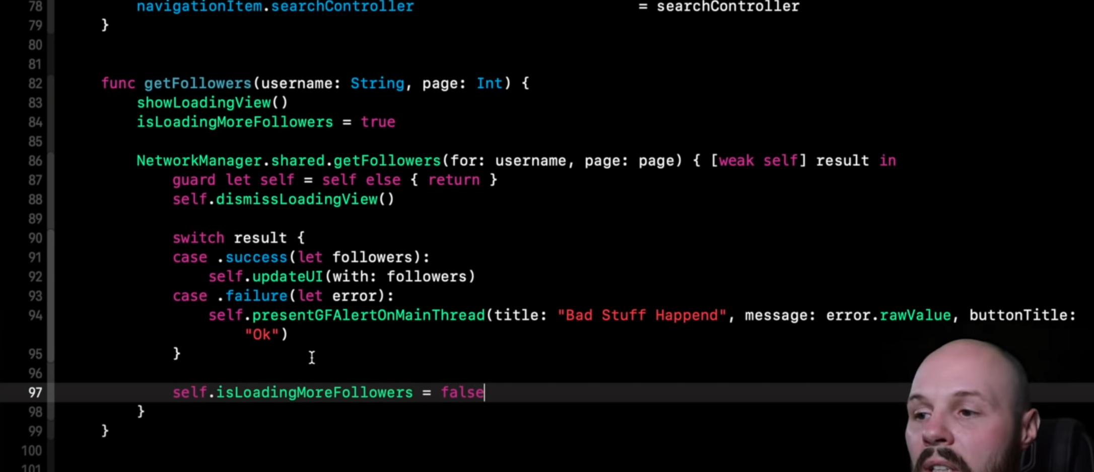 图片中的行是87 (或者这个-> guard let self = self else { return } ),我只是在做和他一样的事情,但是我想知道为什么他会在代码中添加这一行。我认为他写它是因为自我可以是零,并且想确定如果自我不是零,如果它得到零,就从函数返回。
