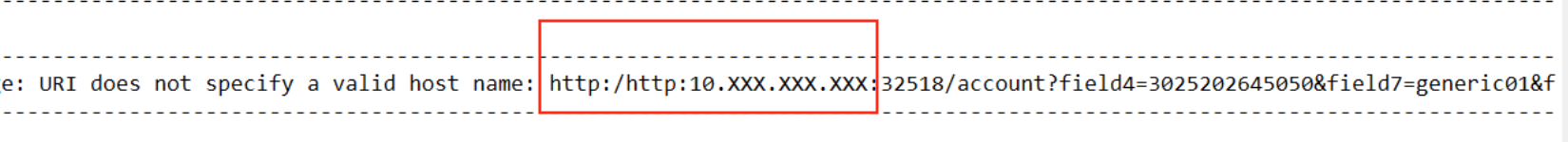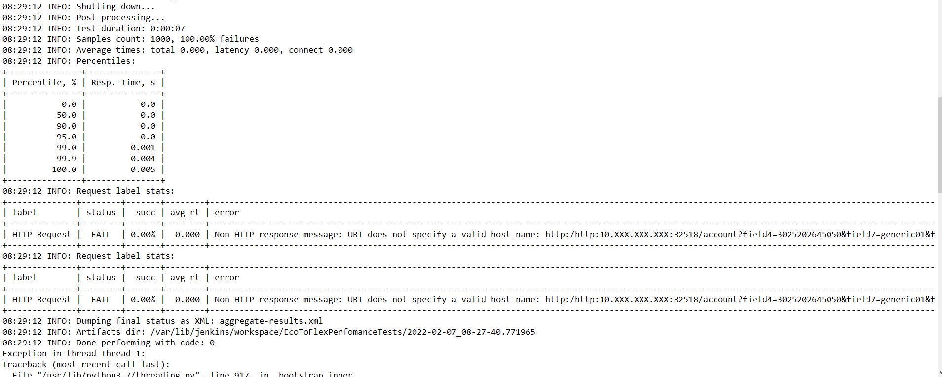 我已经在Jenkins管道中配置了Jmeter,但是当这个阶段运行时,似乎测试没有像预期的那样执行http:/http:10.XXX.XXX.XXX:32518/account?field4=3025202645050&field7=generic01&field10=abc098,在控制台输出中,我可以看到一个错误非HTTP响应消息: URI没有指定一个有效的主机名:。URL被错误地插入,因为它使http 出现了两次。