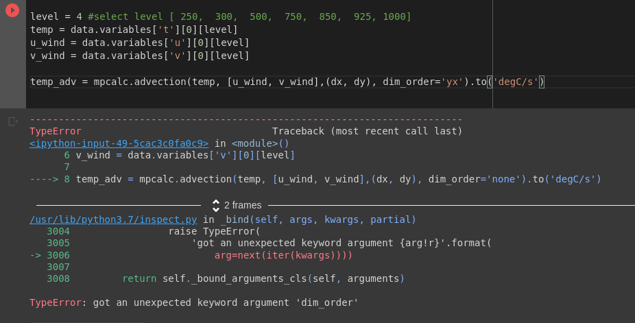 使用ERA5数据。但是计算平流,我得到了一个错误:TypeError: got an unexpected keyword argument 'dim_order'