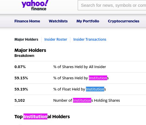 {'symbol': 'APPL', 'quoteType': 'MUTUALFUND', 'exchange': 'YHD', 'exchangeTimezoneName': 'America/New_York', 'exchangeTimezoneShortName': 'EST', 'gmtOffSetMilliseconds': '-18000000', 'market': 'us_market', 'isEsgPopulated': False, 'quoteSourceName': 'Delayed Quote', 'regularMarketOpen': None, 'averageDailyVolume3Month': None, 'regularMarketTime': 1561759658, 'volume24Hr': None, 'regularMarketDayHigh': None, 'shortName': None, 'averageDailyVolume10Day': None, 'longName': None, 'regularMarketChange': None, 'regularMarketPreviousClose': None, 'preMarketPrice': None, 'exchangeDataDelayedBy': 0, 'toCurrency': None, 'postMarketChange': None, 'postMarketPrice': None, 'exchangeName': 'YHD', 'preMarketChange': None, 'circulatingSupply': None, 'regularMarketDayLow': None, 'priceHint': 2, 'regularMarketPrice': None, 'regularMarketVolume': None, 'lastMarket': None, 'regularMarketSource': 'DELAYED', 'openInterest': None, 'marketState': 'POST', 'underlyingSymbol': None, 'marketCap': None, 'volumeAllCurrencies': None, 'strikePrice': None, 'maxAge': 1, 'fromCurrency': None, 'logo_url': ''}但是,在雅虎的截图中,没有任何类似于您的信息需求(给定号码的5,102)的institution或任何其他计数!AAPL的财务页面:
