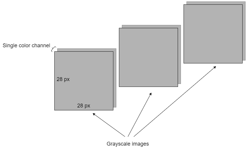 一批3幅灰度图像可以用三维NumPy阵列或张量表示。在这里,我们需要一个额外的维度来表示图像的数量。