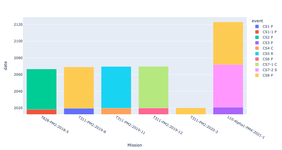 figure = px.bar(data_frame, x='Mission', y='date', color='event').update_xaxes(categoryorder='category ascending')#.update_layout(legend_traceorder='normal')