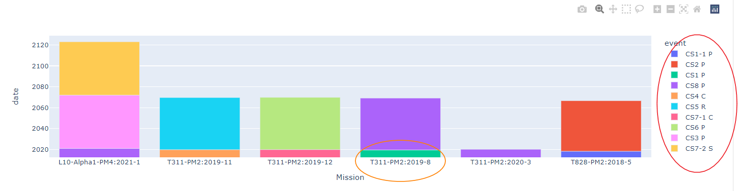figure = px.bar(data_frame, x='Mission',y='date', color='event',\