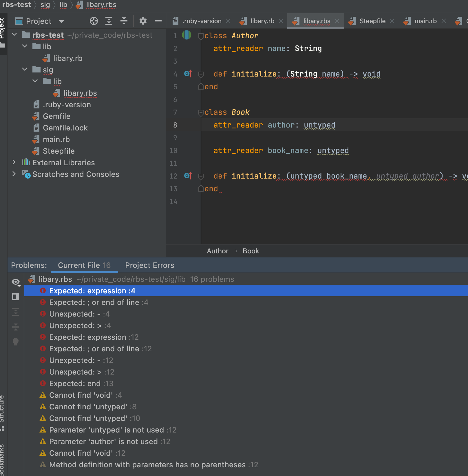 这是错误图像,看起来RubyMine不识别rbs文件