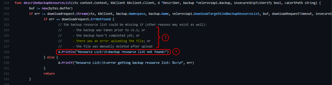 不确定这是否解决了每个人的问题,但它对我有效。在velero 源代码回购中搜索之后,我找到了下面的go包describer.go,它包含了在描述失败的备份时发现的错误消息。