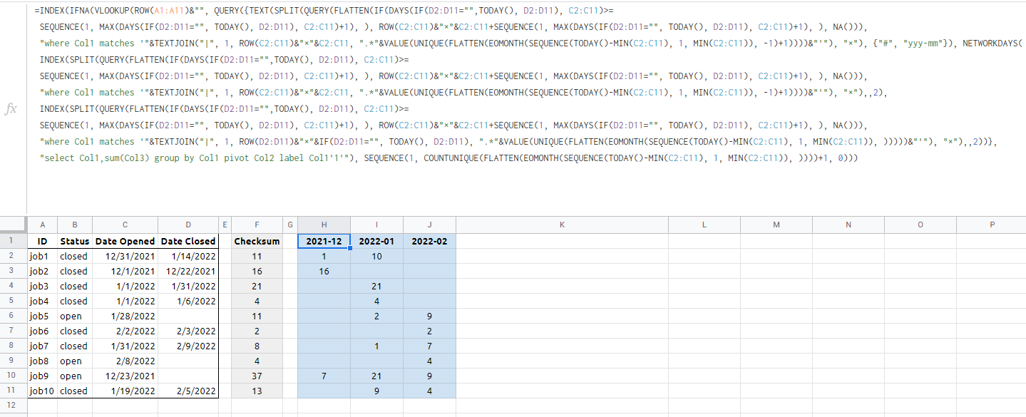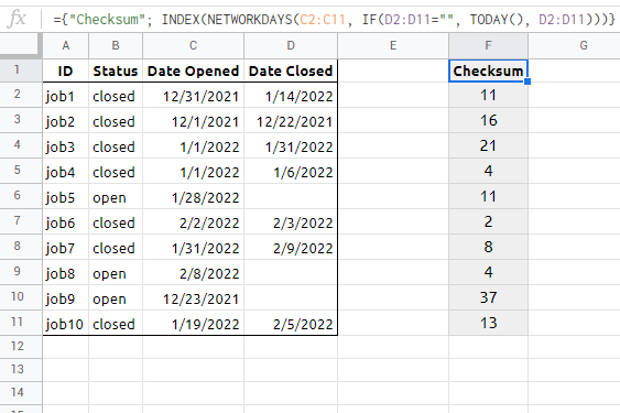 ={"Checksum"; INDEX(NETWORKDAYS(C2:C11, IF(D2:D11="", TODAY(), D2:D11)))}