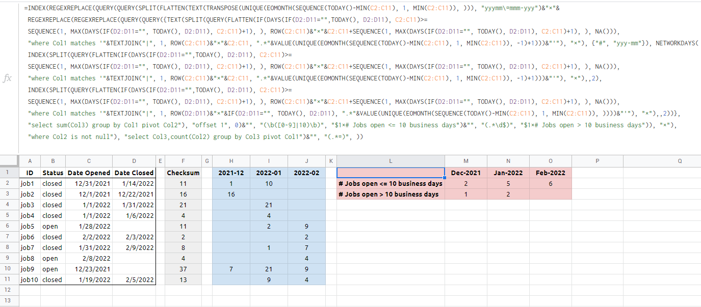 我有一个职位空缺列表(输入选项卡),我需要跟踪每月的指标。我的指标需要计算为<=10工作日开放的职位空缺数和每月开放超过10个工作日的职位空缺数,而忽略假日。