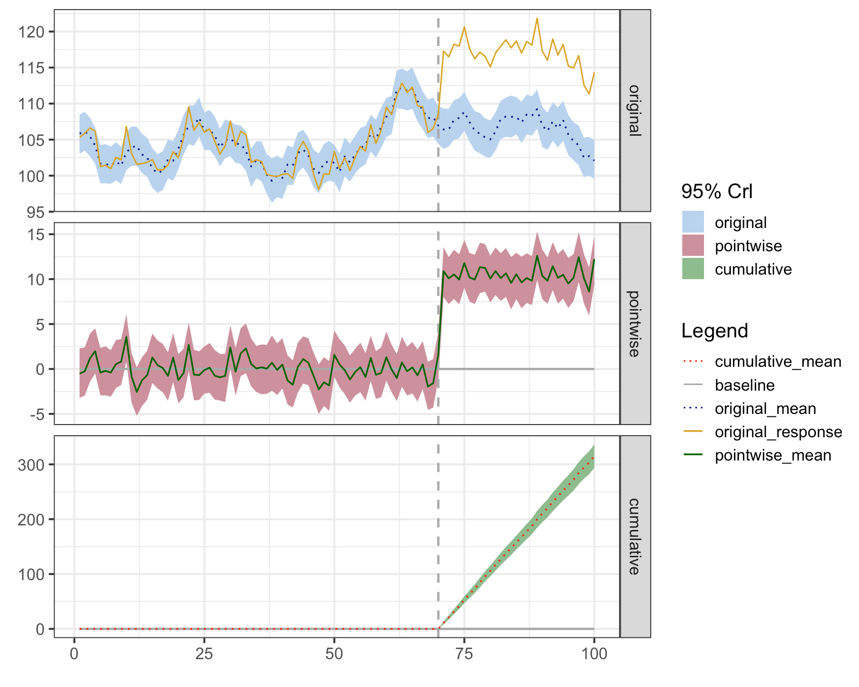 values = c("cumulative_mean" = "red", "baseline" = "darkgrey", "original_mean"= "darkblue", "original_response" = "goldenrod"))向量"line_labels“是定义要在”图解“中显示的文本的地方。您将注意到,我删除了点相关值,因为我将点态度量从绘图中排除在外。scale_linetype_manual和scale_color_manual必须保持名称和标签的同步,这样才能有一个合并的传奇,否则就会有两个不同的传说。scale_fill_manual是给缎带的。对于这些比例,您可以根据需要更改名称、标签和值。您可以从函数中复制代码,修改它,并将其添加到上面所示的绘图调用中。