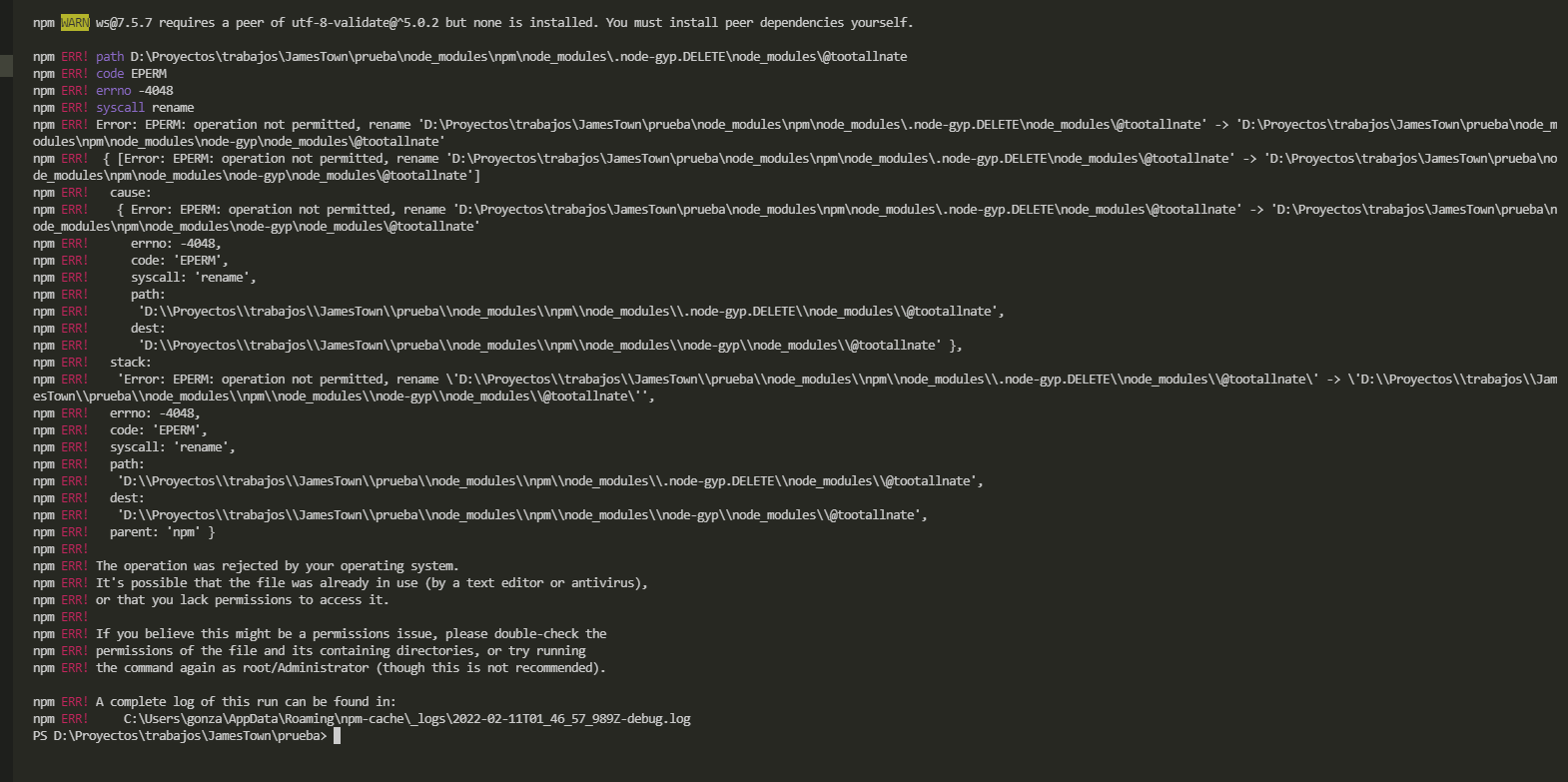 这个错误发生在我想要做npm安装和它被取消的过程中,应该注意,这是以前没有发生的。
