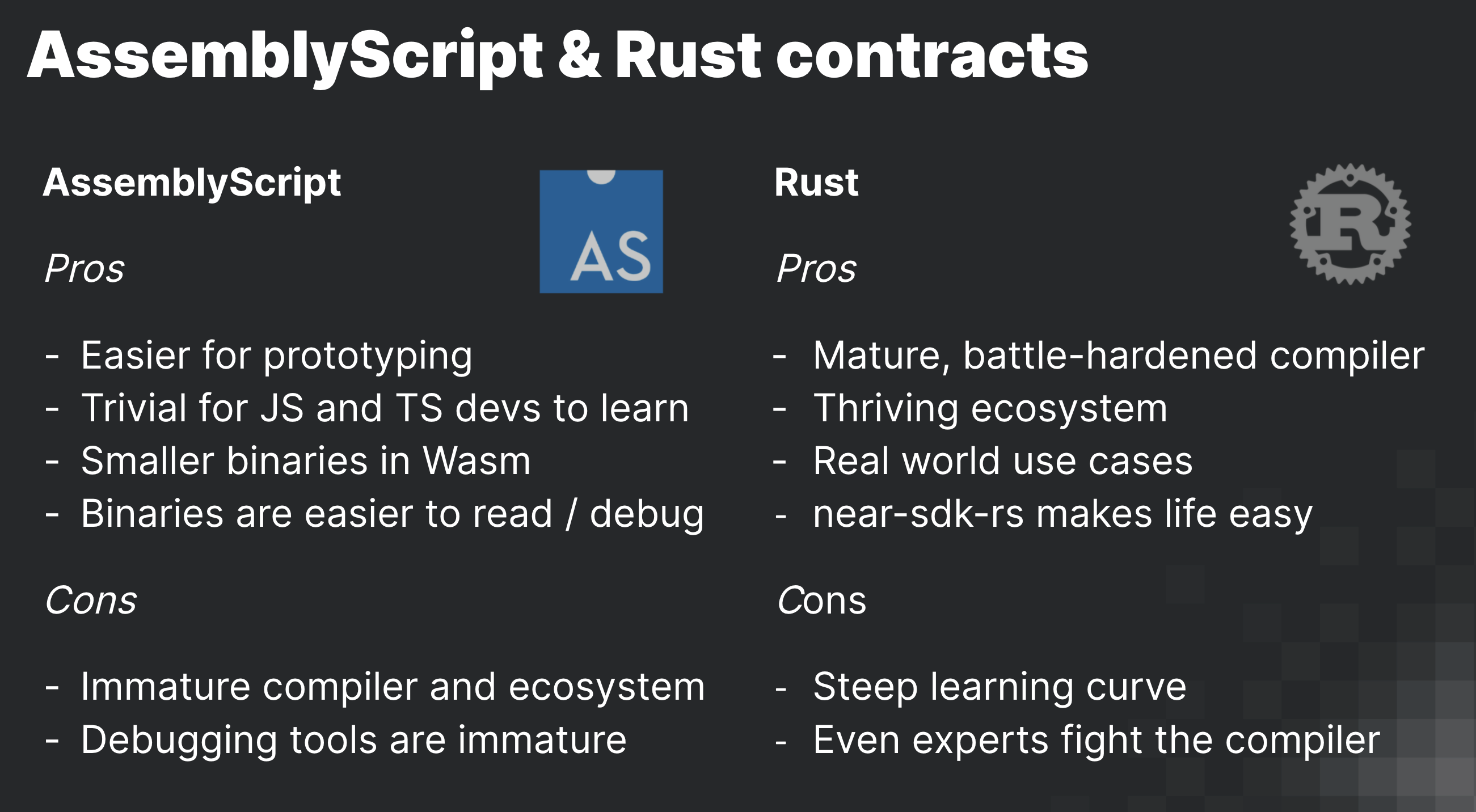 AssemblyScript使web开发人员很容易学会在几个小时内编写智能合同。铁锈需要更长的时间,也许几个星期的练习与在道场的借阅检查;)