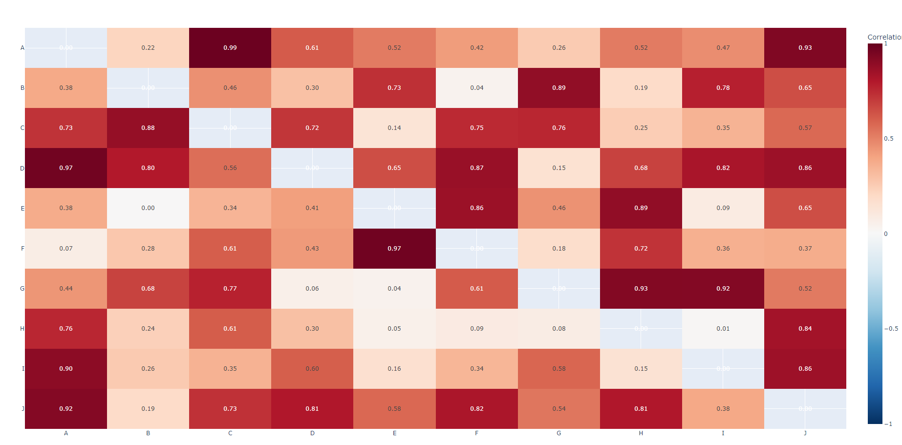 corr.index = ["A", "B", "C", "D", "E", "F", "G", "H", "I", "J"]