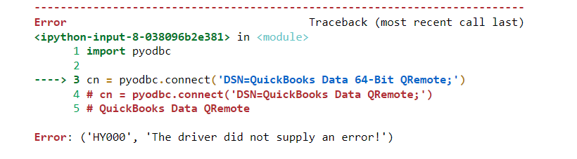 cn = pyodbc.connect('DSN=QuickBooks Data 64-Bit QRemote',autocommit=True)