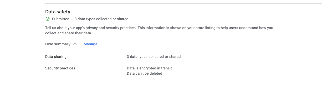 我刚刚更新了我的数据安全表单,添加了Device or other identifiers,因为我的应用程序请求Ad Id、BSSID等等。