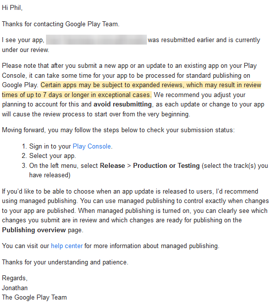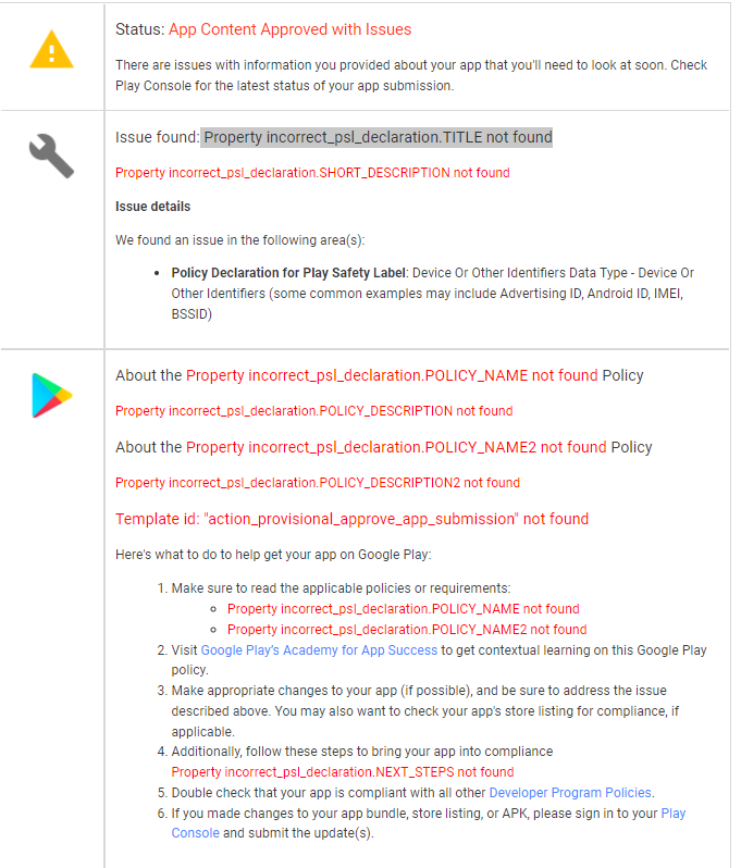 我收到了下面的截图,这对我没有多大帮助。我问通知是关于什么的,他根本没有提到这个问题,所以现在我不知道该怎么做。然而,他确实证实了我的应用程序目前在审查队列中,所以也许我们只需要等待。也许有错误的电子邮件通知可以被忽略。我将等待几天,看看我的应用程序是否通过审查,而不采取任何进一步的行动。