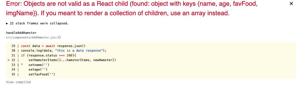 嗨,伙计们还没反应过来,正在开发一个小的反应应用程序,用来显示仓鼠的照片。在AddHamster组件中,我有一个Post请求,似乎运行良好;“对象被传递到数据库!”我的问题是,对象只有在刷新页面后才会显示。我需要仓鼠对象直接显示在页面后,按下添加按钮,连接到表单。