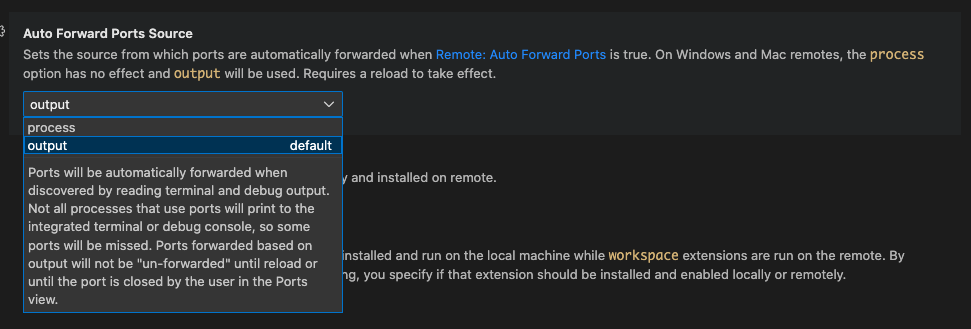 在Windows和Mac上,它从终端输出(remote.autoForwardPortsSource下的remote.autoForwardPortsSource选项)中获取: