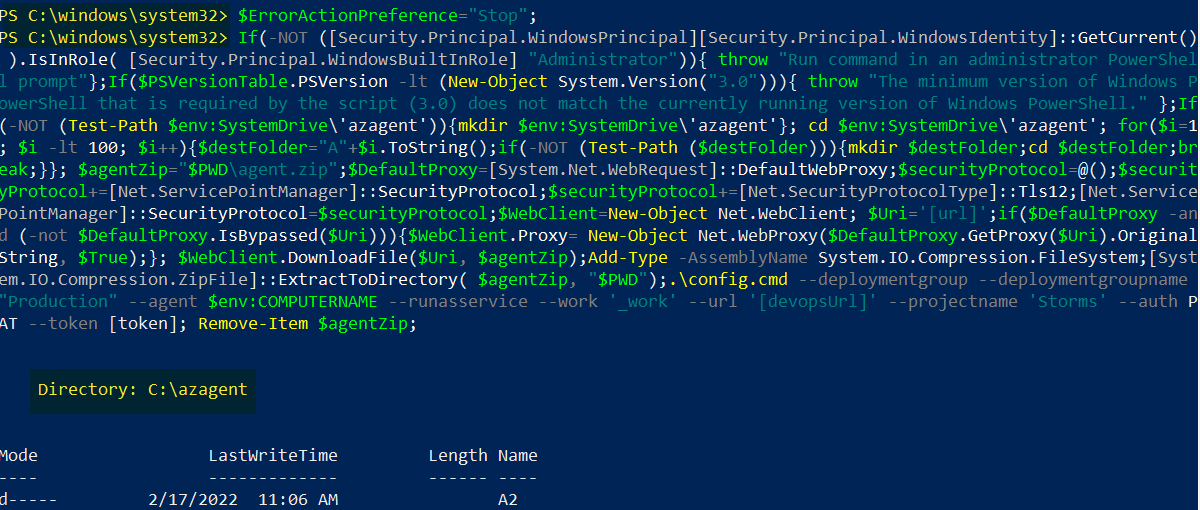 $ErrorActionPreference="Stop";If(-NOT ([Security.Principal.WindowsPrincipal][Security.Principal.WindowsIdentity]::GetCurrent() ).IsInRole( [Security.Principal.WindowsBuiltInRole] “Administrator”)){ throw "Run command in an administrator PowerShell prompt"};If($PSVersionTable.PSVersion -lt (New-Object System.Version("3.0"))){ throw "The minimum version of Windows PowerShell that is required by the script (3.0) does not match the currently running version of Windows PowerShell." };If(-NOT (Test-Path $env:SystemDrive\'azagent')){mkdir $env:SystemDrive\'azagent'}; cd $env:SystemDrive\'azagent'; for($i=1; $i -lt 100; $i++){$destFolder="A"+$i.ToString();if(-NOT (Test-Path ($destFolder))){mkdir $destFolder;cd $destFolder;break;}}; $agentZip="$PWD\agent.zip";$DefaultProxy=[System.Net.WebRequest]::DefaultWebProxy;$securityProtocol=@();$securityProtocol+=[Net.ServicePointManager]::SecurityProtocol;$securityProtocol+=[Net.SecurityProtocolType]::Tls12;[Net.ServicePointManager]::SecurityProtocol=$securityProtocol;$WebClient=New-Object Net.WebClient; $Uri='[url]';if($DefaultProxy -and (-not $DefaultProxy.IsBypassed($Uri))){$WebClient.Proxy= New-Object Net.WebProxy($DefaultProxy.GetProxy($Uri).OriginalString, $True);}; $WebClient.DownloadFile($Uri, $agentZip);Add-Type -AssemblyName System.IO.Compression.FileSystem;[System.IO.Compression.ZipFile]::ExtractToDirectory( $agentZip, "$PWD");.\config.cmd --deploymentgroup --deploymentgroupname "Production" --agent $env:COMPUTERNAME --runasservice --work '_work' --url '[devopsUrl]' --projectname 'Storms' --auth PAT --token [token]; Remove-Item $agentZip;发布于 2022-02-25 22:04:42