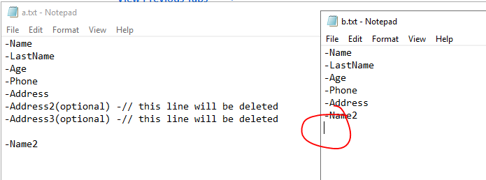 ..but确实注意到b在末尾有一个空行,因为File.WriteAllLines将用一个CRLF结束最后一行(在我的例子中是Name2)。
