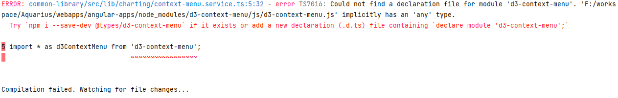 import * as d3ContextMenu from 'd3-context-menu';d3-context-menu在DefinitelyTyped或我能找到的任何其他地方都不存在类型定义。因此,我尝试使用以下说明创建自己的系统:(见此处的“C计划”)