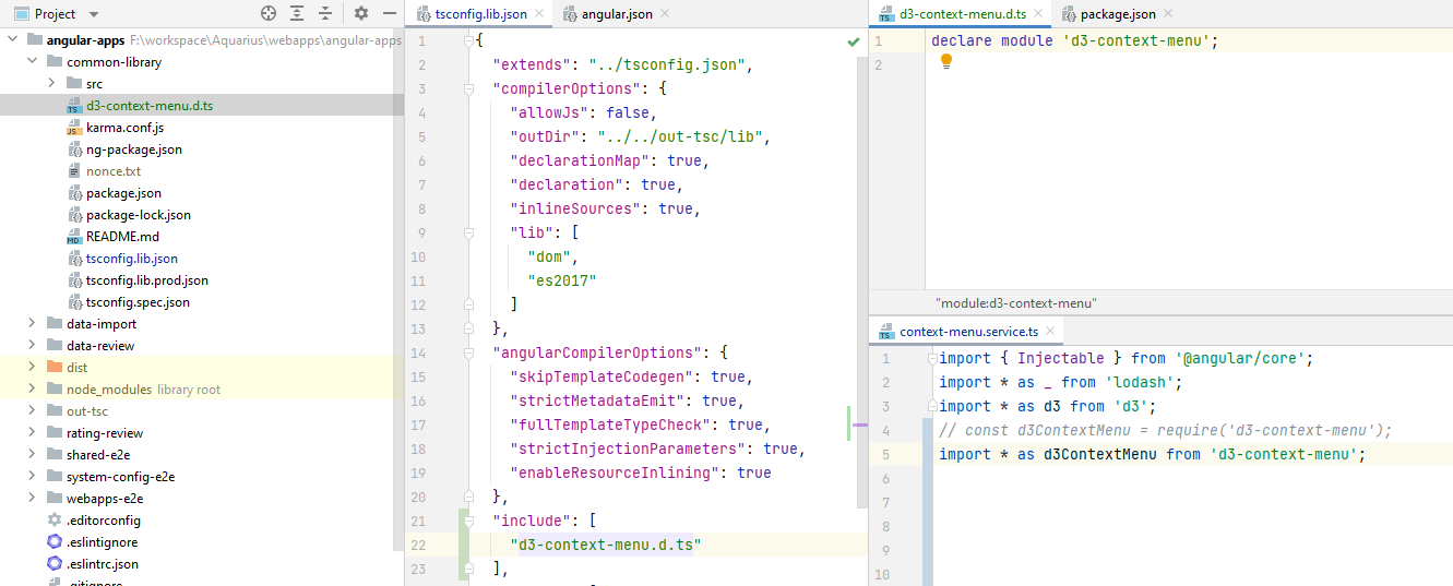 使用ng-packgr构建角库时,它不会将依赖项绑定到库包中。相反,我们通常做的是将库所需的依赖项添加到库的peerDependencies中,然后添加到应用程序的dependencies中。这意味着,即使将d3-context-menu声明添加到库中,TS也无法自动找到它,并且需要在应用程序级别为d3-context-menu指定声明文件。
