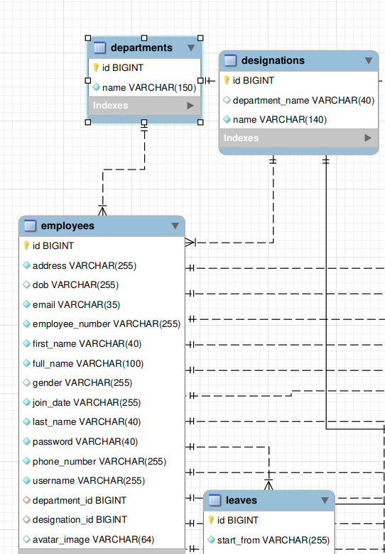 hrms.employees、约束FKe4i9i8vu1j96m71g4v98kqirb外键(designation_id)引用designations(id))