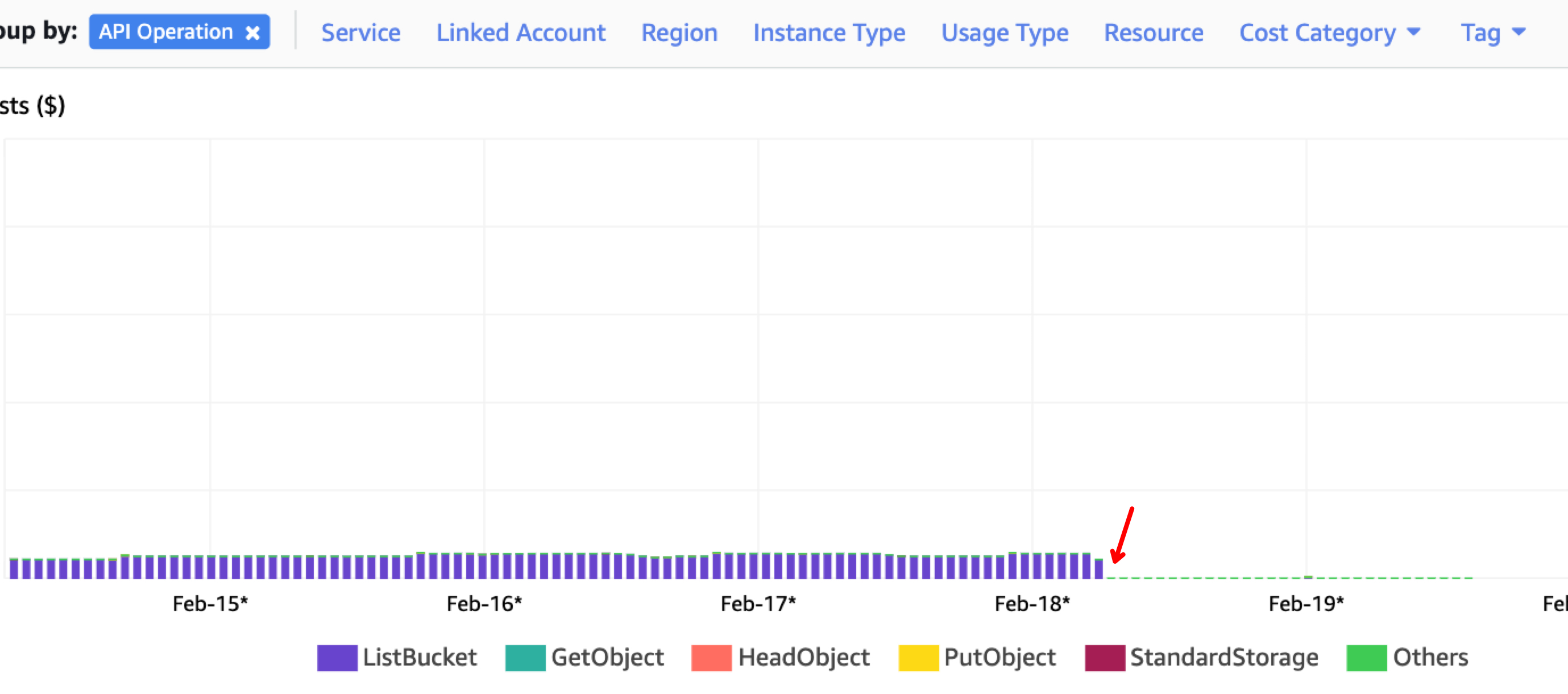 22/02/20 06:44:31 DEBUG wire: http-outgoing-57 << "<ListBucketResult xmlns="http://s3.amazonaws.com/doc/2006-03-01/"><Name>local-audience</Name><Prefix>history-logs/eventlog_v2_spark-ffffdf5903c841259f28b53981746b76/</Prefix><KeyCount>2</KeyCount><MaxKeys>5000</MaxKeys><Delimiter>/</Delimiter><IsTruncated>false</IsTruncated><Contents><Key>history-logs/eventlog_v2_spark-ffffdf5903c841259f28b53981746b76/appstatus_spark-ffffdf5903c841259f28b53981746b76</Key><LastModified>2022-02-12T17:00:15.304Z</LastModified><ETag>"d41d8cd98f00b204e9800998ecf8427e"</ETag><Size>0</Size><Owner><ID></ID><DisplayName></DisplayName></Owner><StorageClass>STANDARD</StorageClass></Contents><Contents><Key>history-logs/eventlog_v2_spark-ffffdf5903c841259f28b53981746b76/events_1_spark-ffffdf5903c841259f28b53981746b76</Key><LastModified>2022-02-12T17:00:15.136Z</LastModified><ETag>"f91cc774d92c6f6c2ca4d0e1a1e76e13"</ETag><Size>868837</Size><Owner><ID></ID><DisplayName></DisplayName></Owner><StorageClass>STANDARD</StorageClass></Contents></ListBucketResult>"为了确保成本来自历史服务器,我关闭了一天,从那时起每个ListBucket都不收费: