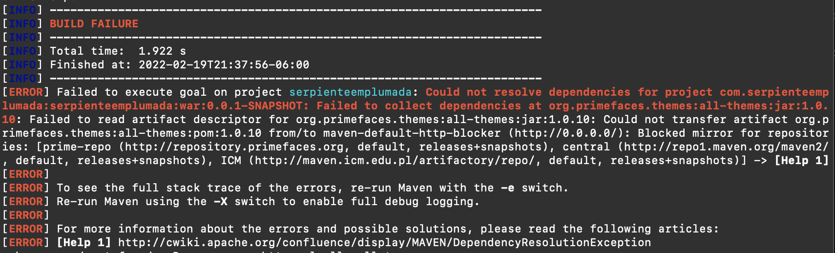 [ERROR] Failed to execute goal on project serpienteemplumada: Could not resolve dependencies for project com.serpienteemplumada:serpienteemplumada:war:0.0.1-SNAPSHOT: The following artifacts could not be resolved: org.primefaces:primefaces:jar:10.0.0, org.primefaces.extensions:primefaces-extensions:jar:10.0.2, org.modelmapper:modelmapper:jar:2.3.5: Could not transfer artifact org.primefaces:primefaces:jar:10.0.0 from/to spring-plugins (https://repo.spring.io/plugins-release/): Access denied to https://repo.spring.io/plugins-release/org/primefaces/primefaces/10.0.0/primefaces-10.0.0.jar. Error code 401, Unauthorized -> [Help 1]