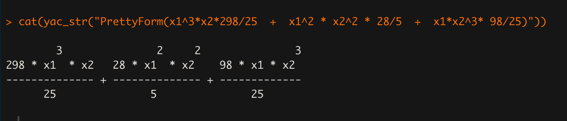 cat(yac_str("PrettyForm(98/25 * x1^3 * x2 + 28/5 * x1^2 * x2^2 + 98/25 * x1 * x2^3)"))