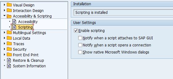 在SAPGUI中,按Alt-F12,然后选择Options、goto脚本,并取消选中下面的所有复选框启用脚本。
