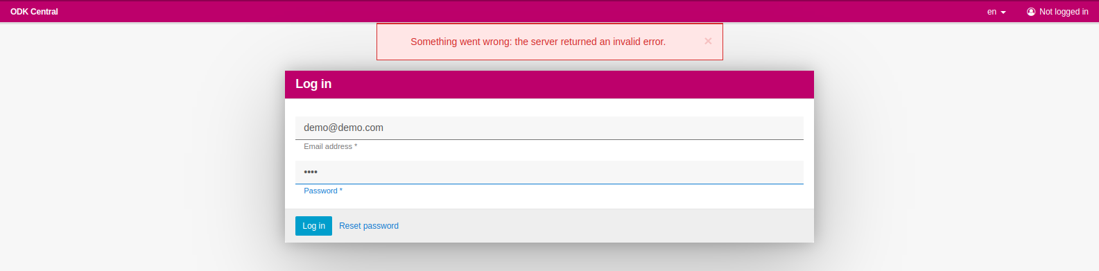 在我决定使用这个URL (https://docs.getodk.org/central-upgrade/)将其更新到ODK的最新版本之前,我的ODK中心运行得非常好,一切都进行得很顺利。更新后,我无法再次登录管理帐户,它继续返回Something went wrong: the server returned an invalid error.。