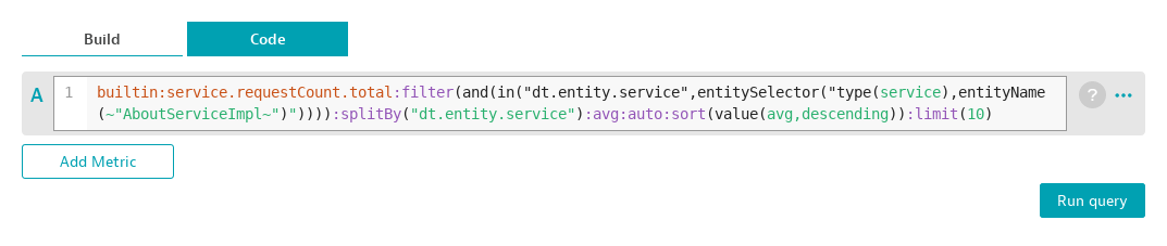 > "metricId": "builtin:service.requestCount.total:filter(and(in(\"dt.entity.service\",entitySelector(\"type(service),entityName(~\"ControllerName~\")\")))):splitBy(\"dt.entity.service\"):avg:auto:sort(value(avg,descending)):limit(100)",