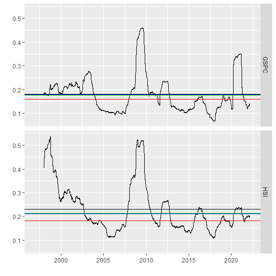 GSPC.new <- merge(GSPC.new,rollapply(GSPC.new$GSPC.adj.ret, 252, sd)) gspc.avg10yr <- mean(na.omit(GSPC.new$GSPC.adj.std.annualised["2011/2022"]))下面的所有代码都可以直接在RStudio中执行。