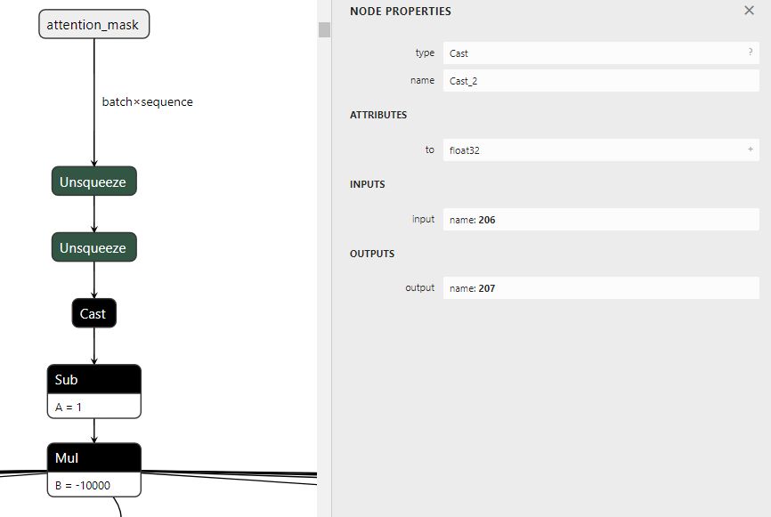 因此,您应该简单地重写您的注意力掩码在模型中的处理方式,一个可能的解决方案是让unsqueeze和cast操作在模型之外。