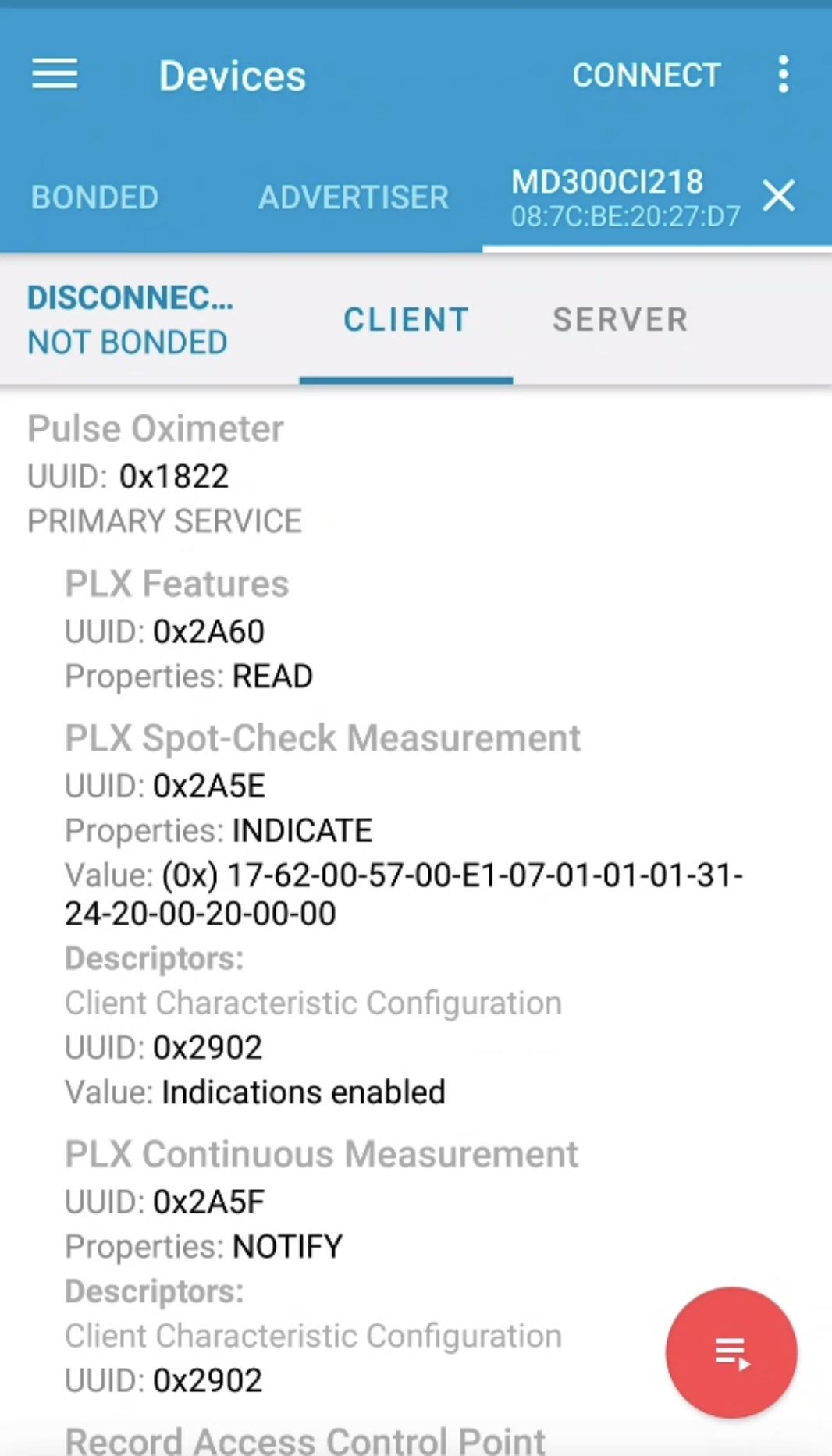 我试着用nrf连接应用程序从脉搏血氧计设备中解码数据。