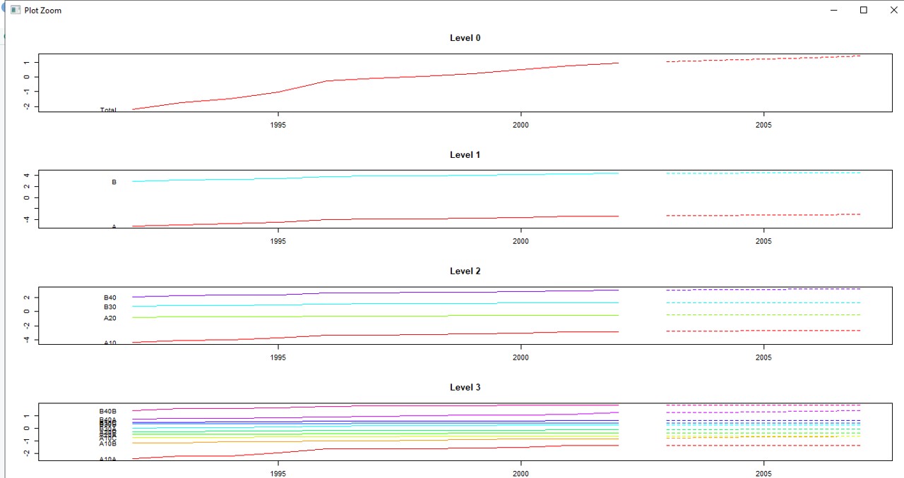 fcasts <- as.data.frame(forecast(data, h = 5, method = "bu"))