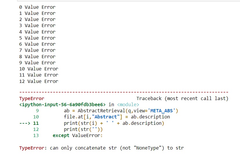 continue当我用10-15个条目测试这段代码时,它工作得很好,我检索了所有的摘要。但是,当我使用3590个EID运行实际文件时,在类型错误(‘只能将str (而不是"NoneType")连接到str曲面)之前,输出将是一系列10-12值错误。
