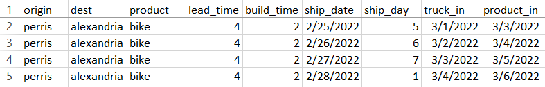 (origin, dest, product, ship_date): (origin, dest, product, truck_in)
