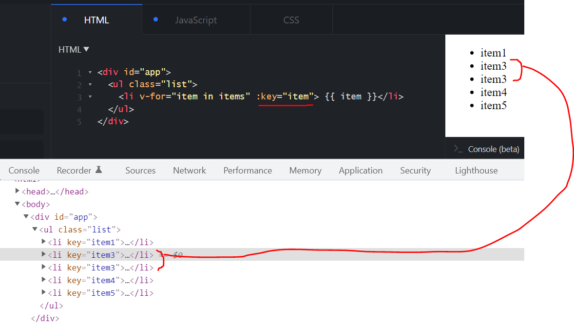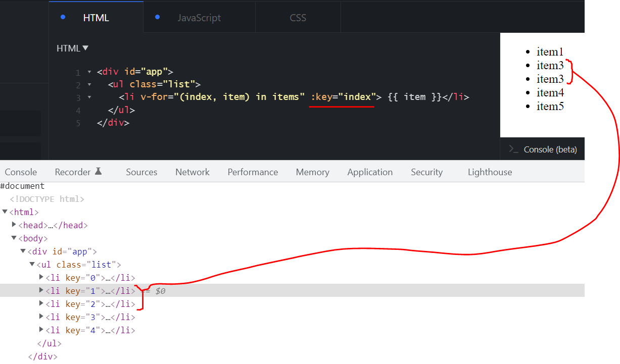 在第二种情况下,v也迭代items的所有元素,但是它引入了另一个名为i的变量,它在items中表示item的数值索引。然后将此索引分配给:key。这样做更好,因为索引不能重复。