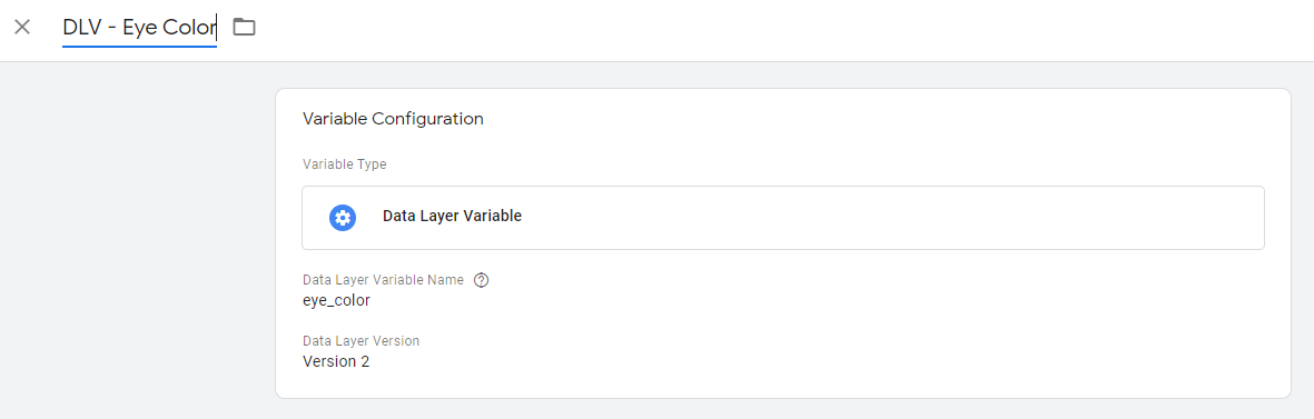 当您部署一个像素并需要使用javascript在其中使用眼睛颜色时,您可以通过引用GTM变量的名称而不是DL:{{DLV - Eye Color}}