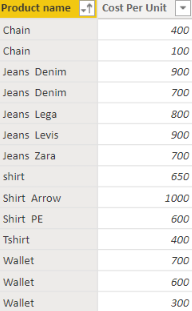 SUMMARIZE ( Data, Data[Product name], Data[Cost Per Unit] ),
