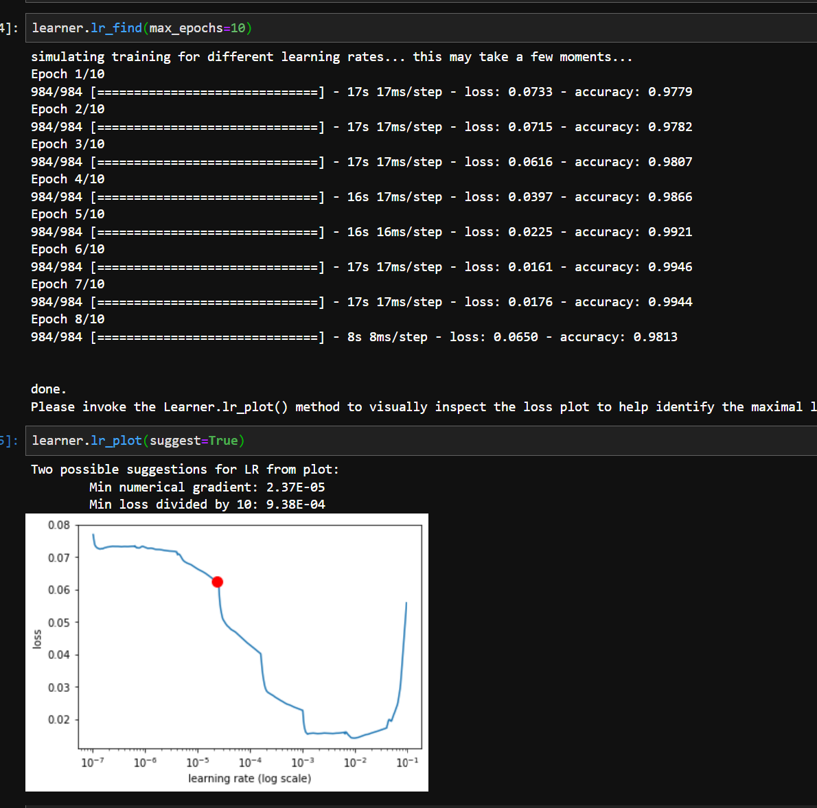 lr_find和lr_plot是ktrain中的函数。它们可以用来突出显示最佳学习率,这是显示在情节中的红点。