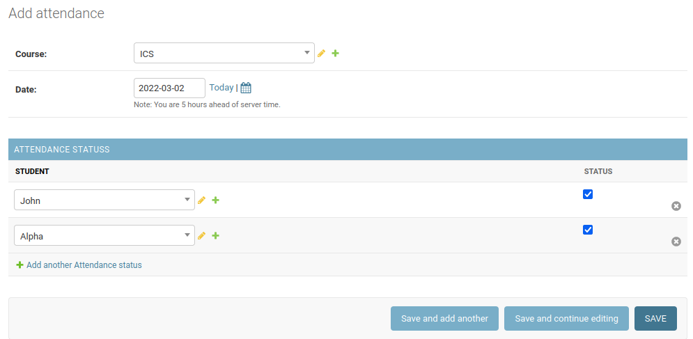 我要列出所有的学生与status=True默认在django管理内联。所以老师不必为每个学生敲状态复选框,默认情况下每个学生都应该在场(status=True),老师只需要取消对缺席者的状态检查。我搜索了很多,但很难找到解决方案。这就是我想要的: